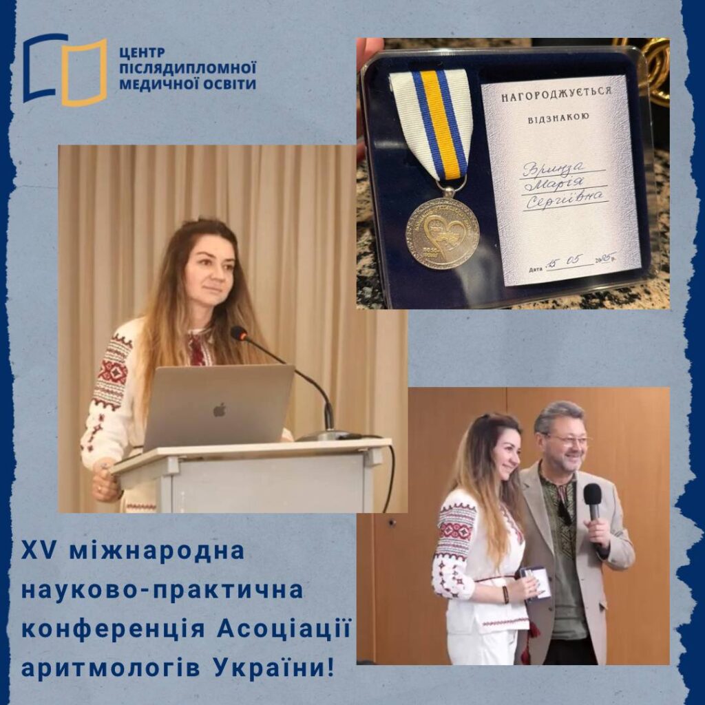 Так, з доповіддю за результатами власних наукових досліджень виступила завідувач кафедри кардіології та функціональної діагностики, д. мед. н., проф., досвідчений лікар-кардіолог Віра ЦЕЛУЙКО та завідувач кафедри пропедевтики внутрішньої медицини та фізичної реабілітації, к. мед. н., доц., лікар-терапевт, лікар фізичної та реабілітаційної медицини Марія БРИНЗА. Після доповіді від імені Асоціації аритмологів України Віру Йосипівну та Марію Сергіївну нагороджено почесними відзнаками «15 років товариства аритмологів». Вітаємо шановну Віру Йосипівну та шановну Марію Сергіївну з черговими заслуженими нагородами і бажаємо нових досягнень!