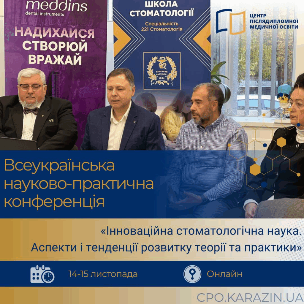 Кафедра стоматології ІІ медичного факультету Харківського національного університету імені В. Н. Каразіна запрошують науковців до участі у Всеукраїнській науково-практичній конференції «Інноваційна стоматологічна наука. Аспекти і тенденції розвитку теорії та практики» з нарахуванням балів БПР учасникам та спікерам заходу. Конференція буде проведена у змішаному форматі 14 – 15 листопада 2025 року.