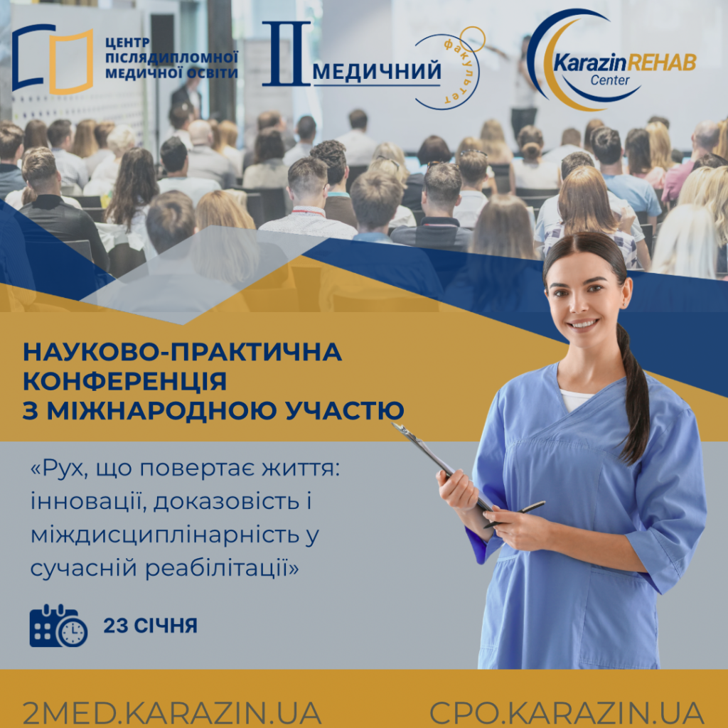 Кафедра фізичної терапії та реабілітаційної медицини ІІ медичного факультету Харківського національного університету імені В. Н. Каразіна анонсує проведення 23 січня 2026 року науково-практичної конференції з міжнародною участю «Рух, що повертає життя: інновації, доказовість і міждисциплінарність у сучасній реабілітації» для студентів та молодих вчених та запрошує всіх зацікавлених до участі в очному або дистанційному форматі.